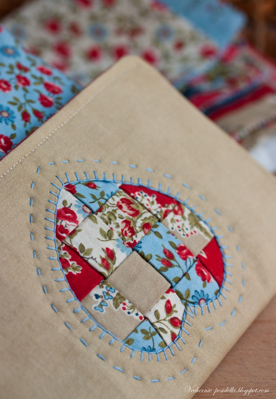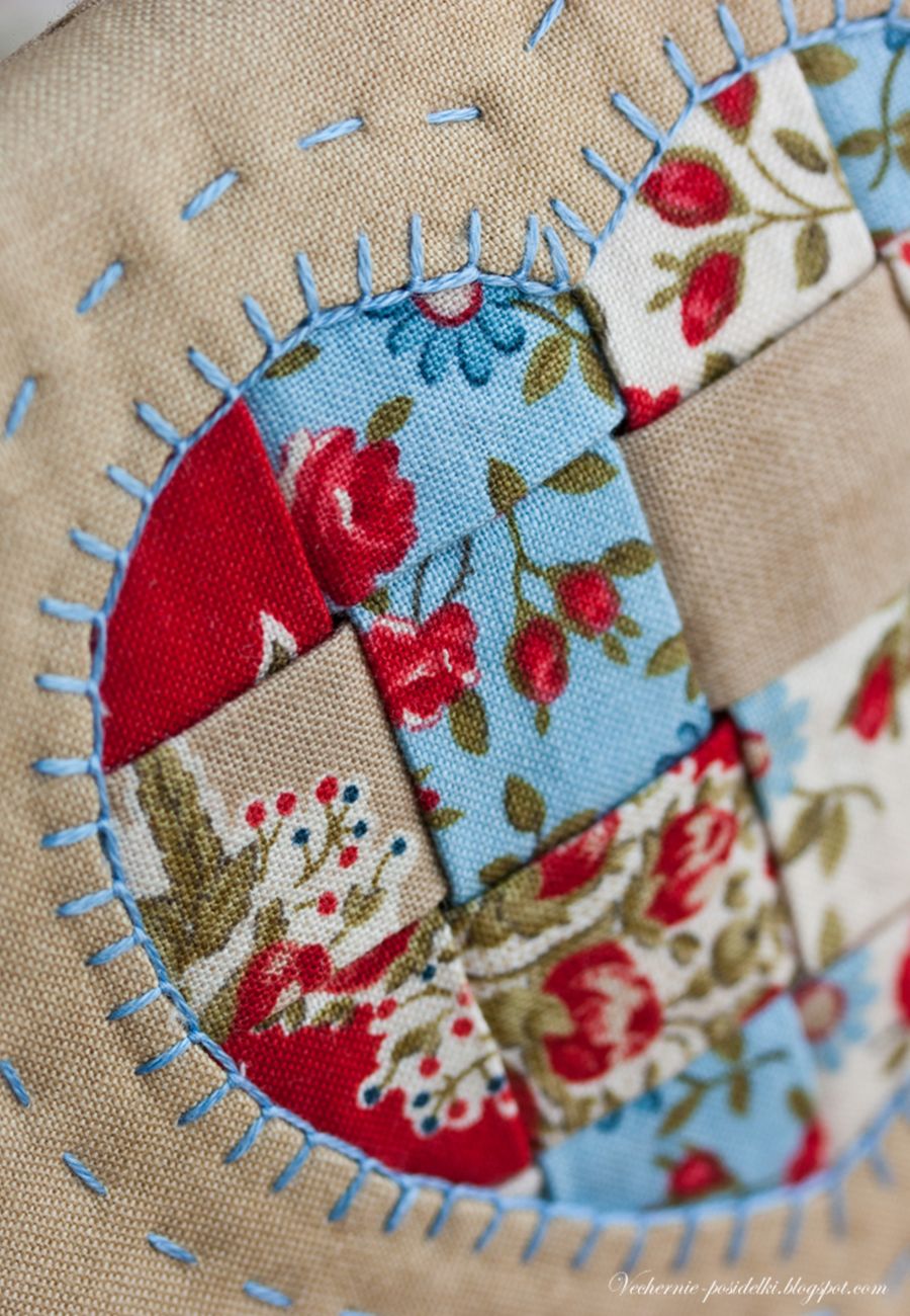 На первый взгляд кажется, что сердечко сшито из лоскутков, на самом же деле оно сплетено как корзинка. Какие только идеи не приходят в голову, когда увлечешься идеей «безотходного производства» и пытаешься пристроить очередные обрезки. :) Сердечко вставлено в вырезанное в бежевой ткани «окошко» и пришито двумя рядами ручных стежков.