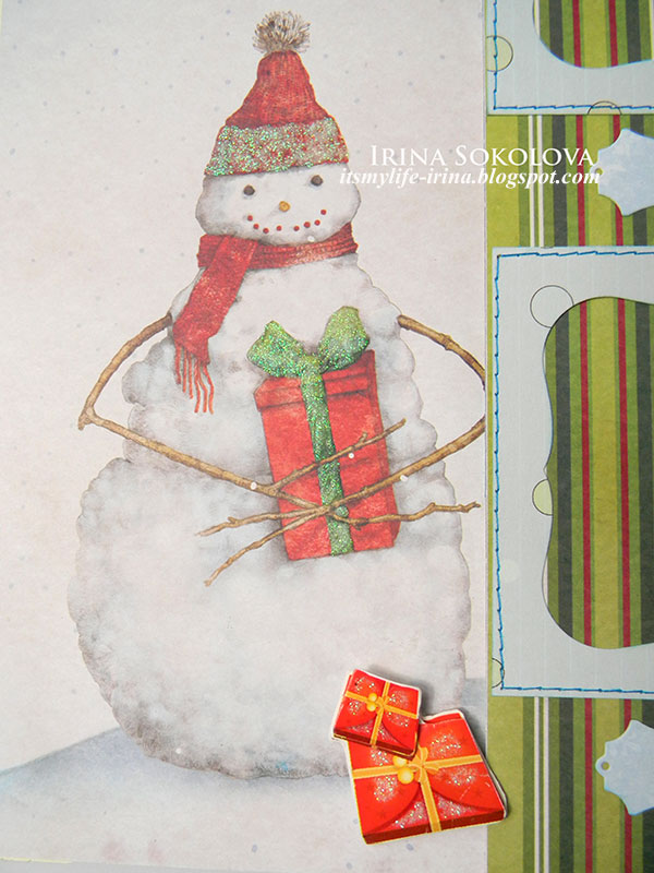 Подарки, снеговика и снежок на домике и елях покрыла акриловой краской с блестками.