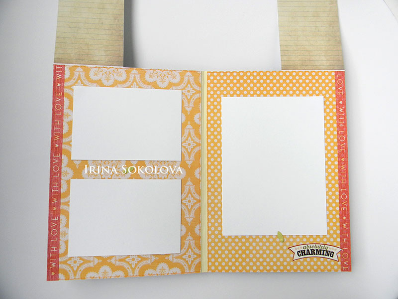 Четвертый разворот. 6 и 7 месяц. Боковые панели открываются вверх и за ними можно написать заметки о малыше. Они же держат подложки для фото, которые наполовину будут спрятаны за панельками.