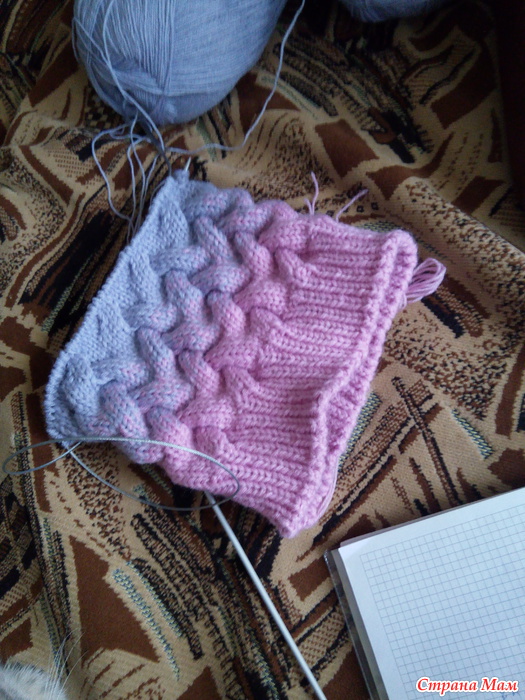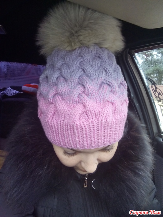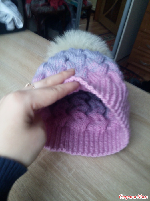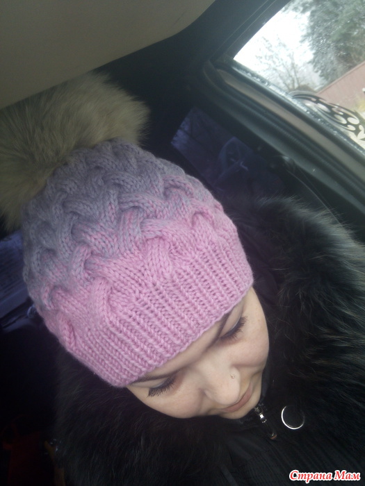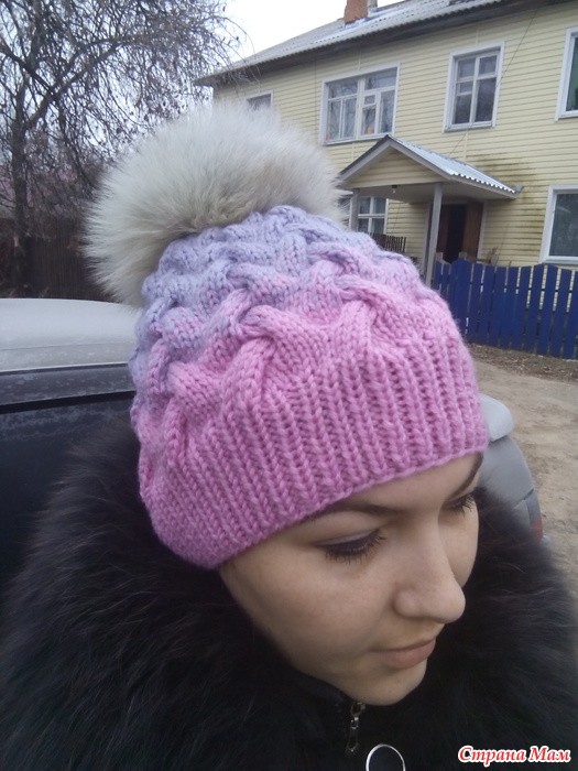 И вот первый вариант с итальянским набором петель. Я с ним не подружилась и перевязывала. Цвета на шапке намного насыщеней. Фото искажает и плюс пасмурно