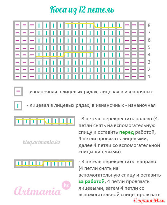 Я вязала по схеме... но не по 3 лицевых ряда, а 4 ряда между перехлестами.