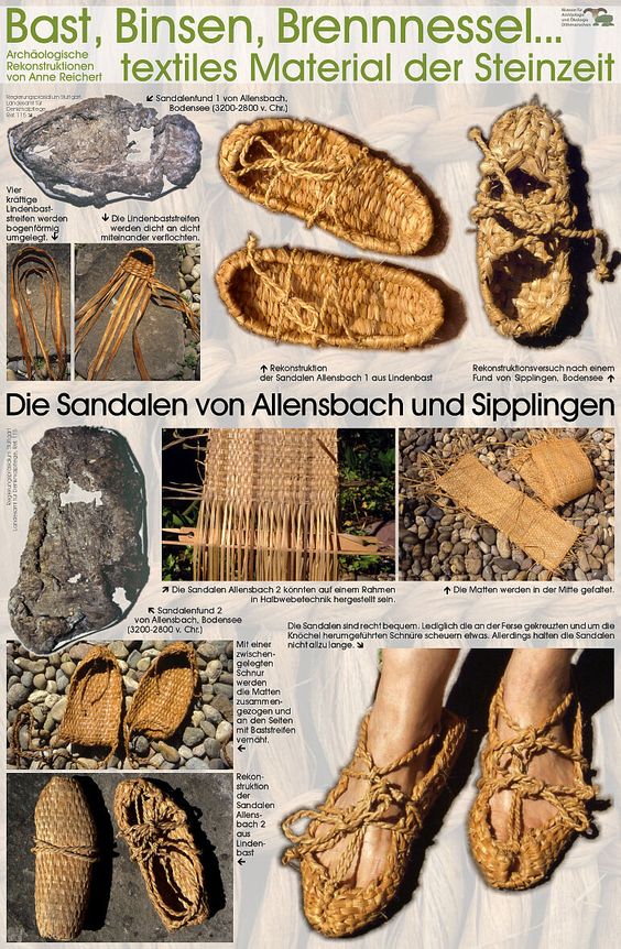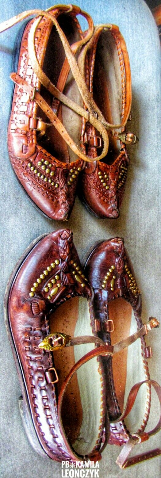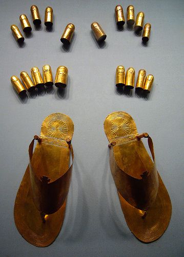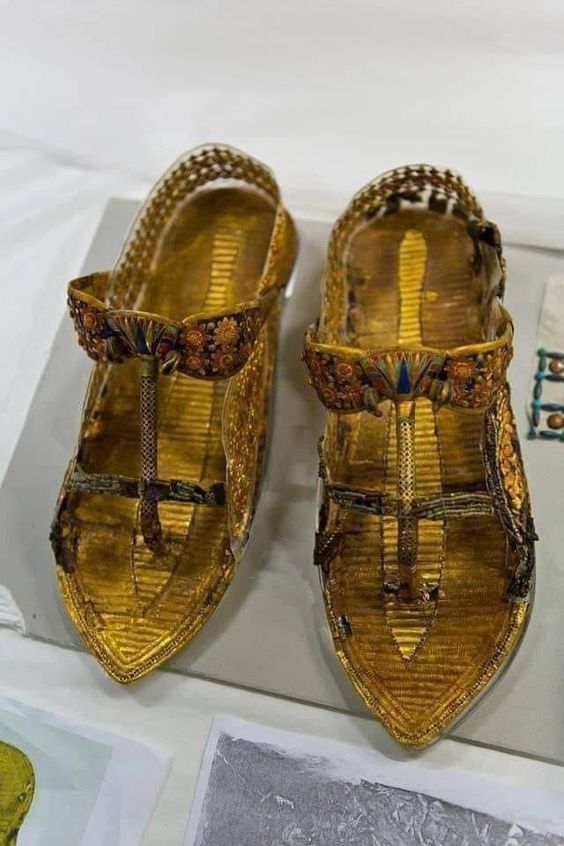 Первая обувь появилась в древнейшие времена, вероятно, её делали из звериных шкур, или, например, как в Древнем Египте - оборачивали ступни в крепкие кожистые листья растений и обматывали кожаным шнуром. Помню, в детстве я летом обматывала ноги длинными травинками мятлика и мне нравилось думать, что это травяные сандалии)) Но не стоит думать, что древние только травками и обматывались, египтяне знали толк в роскоши и умели её создавать.