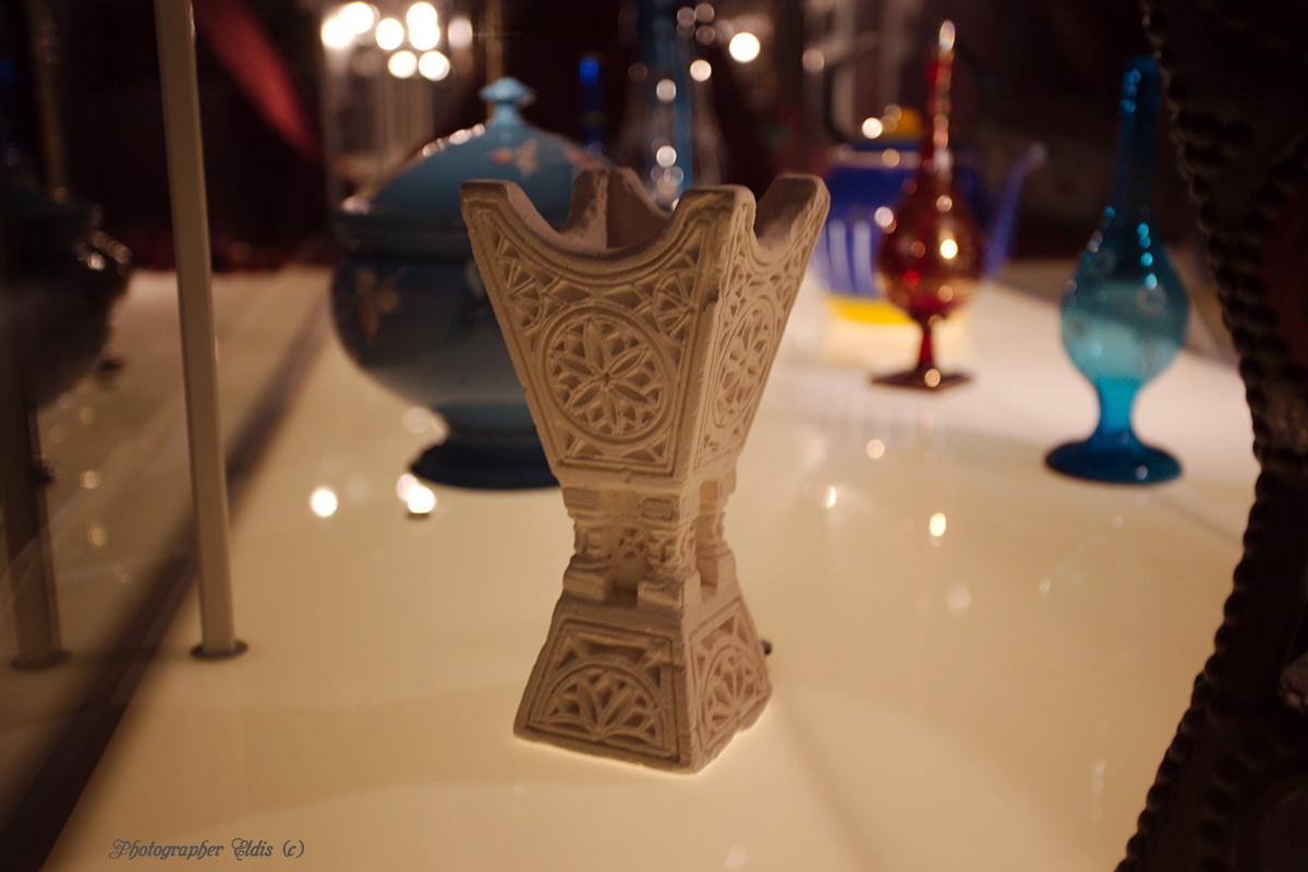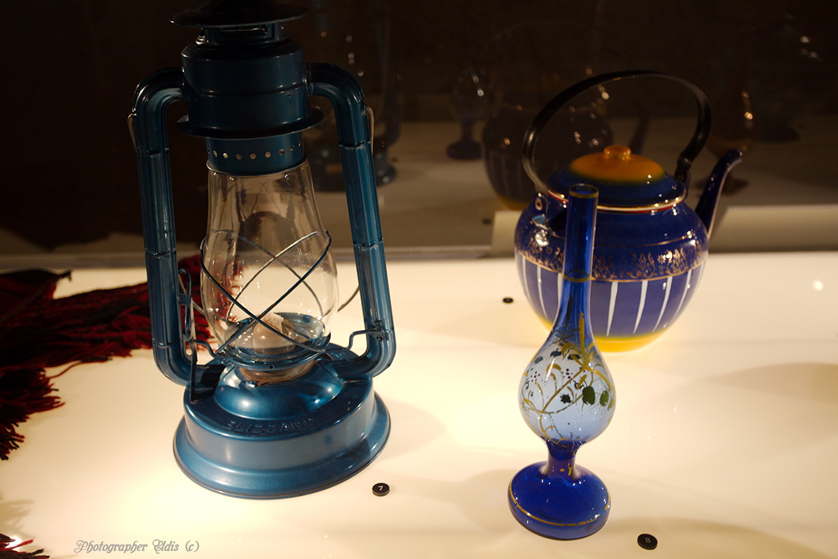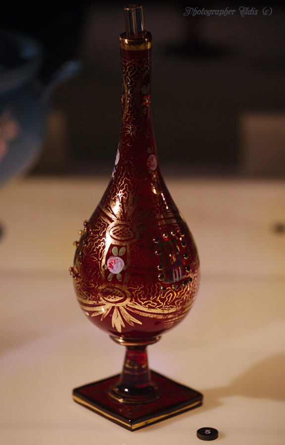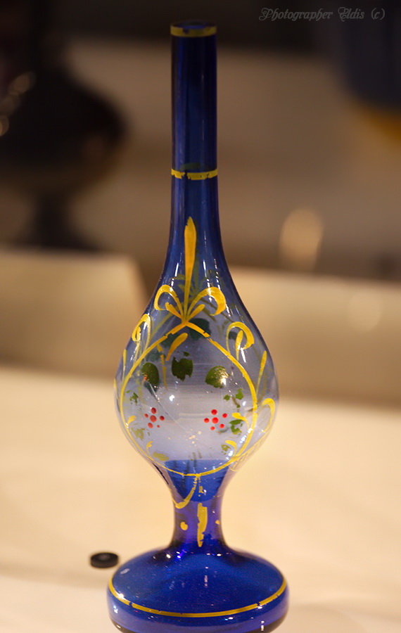 На витрине сосуды из стекла для хранения душистых масел, курильницы для благовоний и драгоценных смол, другие экспонаты.