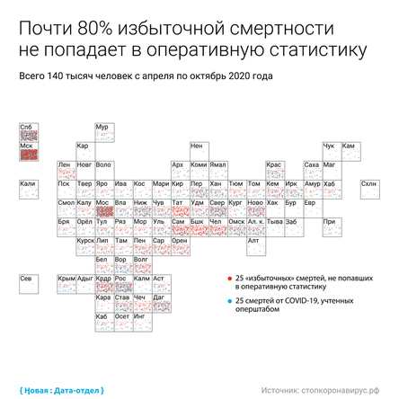 Избыточная смертность показывает, насколько общее количество смертей от всех причин в течение эпидемии было выше среднего. Этот показатель сложнее сгладить или подрисовать: даже если скрыть причину смерти, общее число умерших покажет рост смертности.