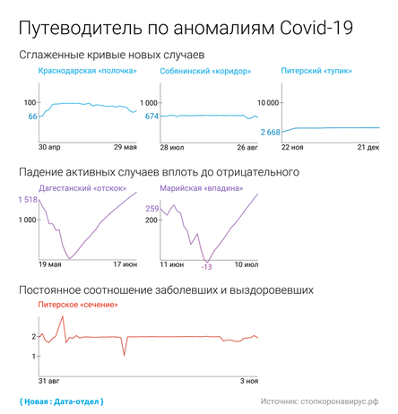 Эксперты нашли несколько основных типов аномалий, которые показывают, что данные «рисованные»: неправдоподобно гладкие цифры выявленных больных в течение долгого времени («полочки» и «коридоры»), резкое падение числа активных случаев вплоть до отрицательного и затем резкий взлет («дагестанский отскок»), а также постоянное соотношение числа заболевших и выздоровевших.