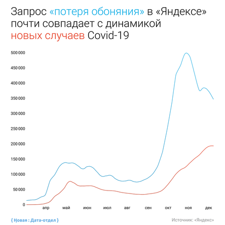 «Где-то с середины лета у нас сложилось мнение, что в первую очередь имеет смысл смотреть на запросы про потерю обоняния, так как это наиболее специфичный для коронавируса симптом. Динамику по этой группе запросов мы, естественно, проверяем по десяткам, а то и сотням других запросов про симптомы, лекарства, диагностику, обследования и так далее», — объясняет он.