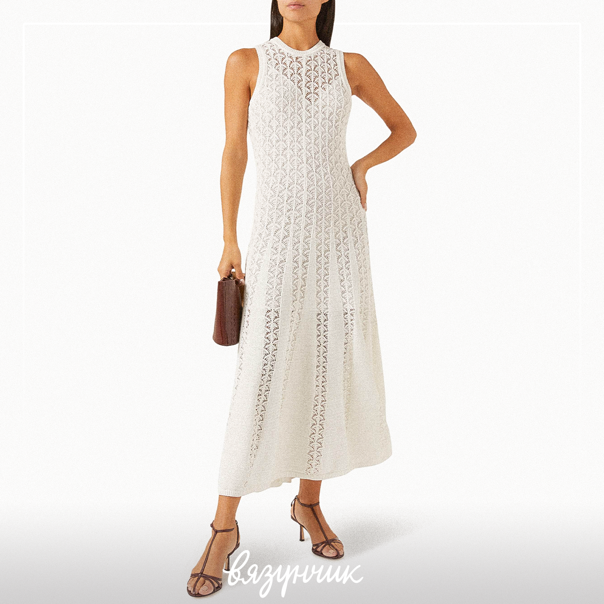 В этом платье интересен не только сам узор, но и способ его применения в изделии. Обратите внимание, как платье расширяется вниз, а точнее сужается вверх из-за сокращений в полосках лицевой глади. При этом элементы ажурного узора постепенно соединяются в верхней части. Думаю, что такие манипуляции будут актуальны и для других ажурных узоров. Т.е. можно получить довольно интересный результат, разбив узор на части, а затем соединив их через какое-то расстояние.