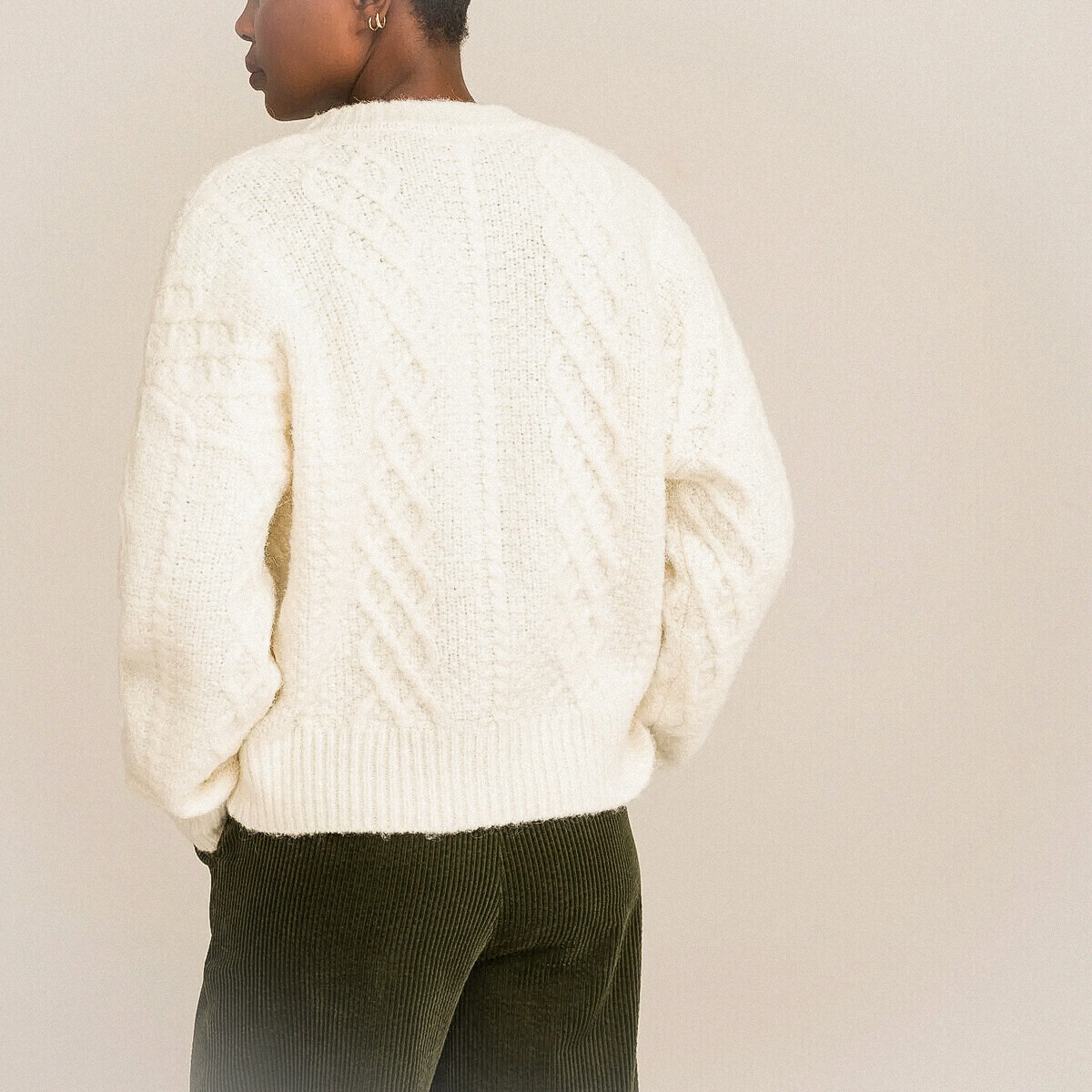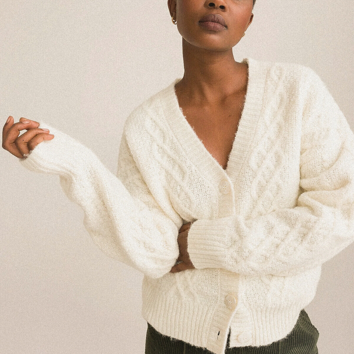 Кремовый кардиган на пуговицах, украшен незамысловатыми переплетениями, выполненными на фоне узора "рис".