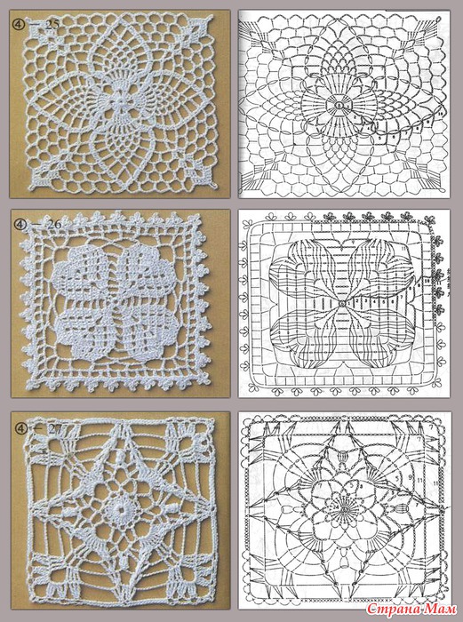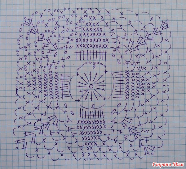 Юбочку начинаем вязать от верхней полосы из квадратных мотивов, схем есть несколько, я начала по последней.