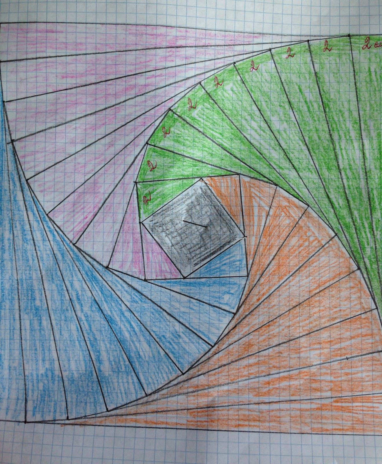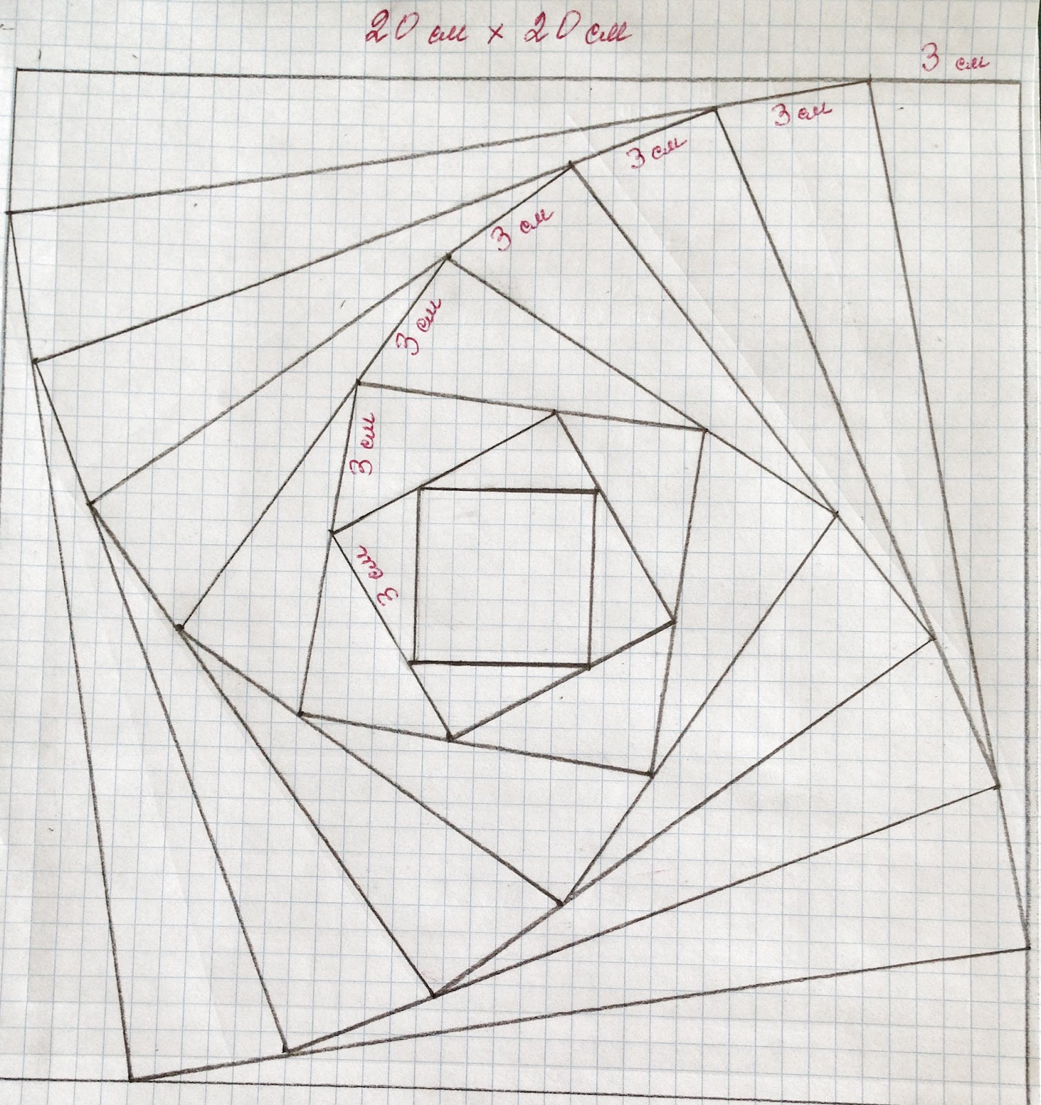 Почему-то возникает мысль, что в каждом новом квадрате нужно отступать от угла всё меньше и меньше. Ведь квадратик-то становится меньше!