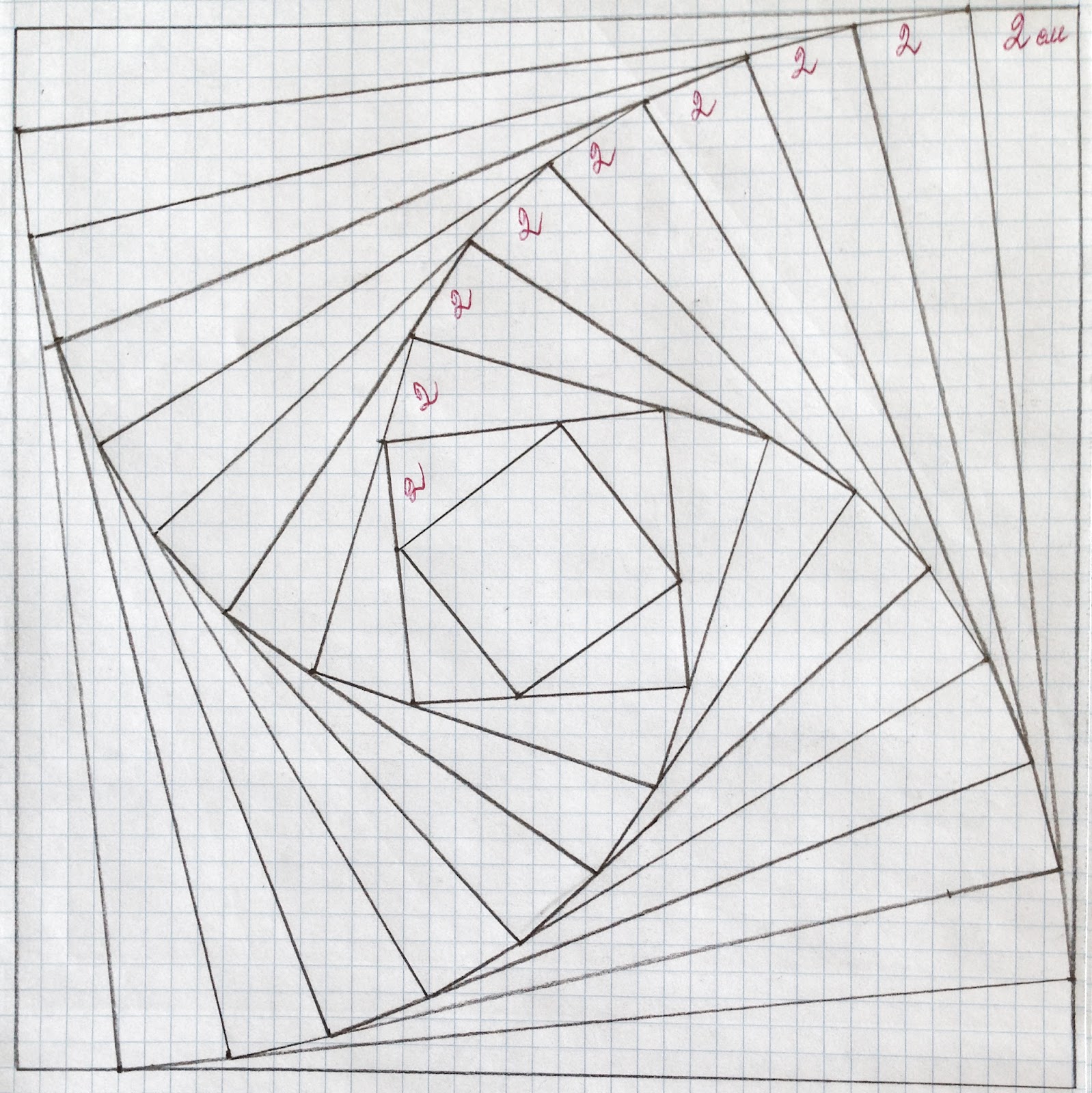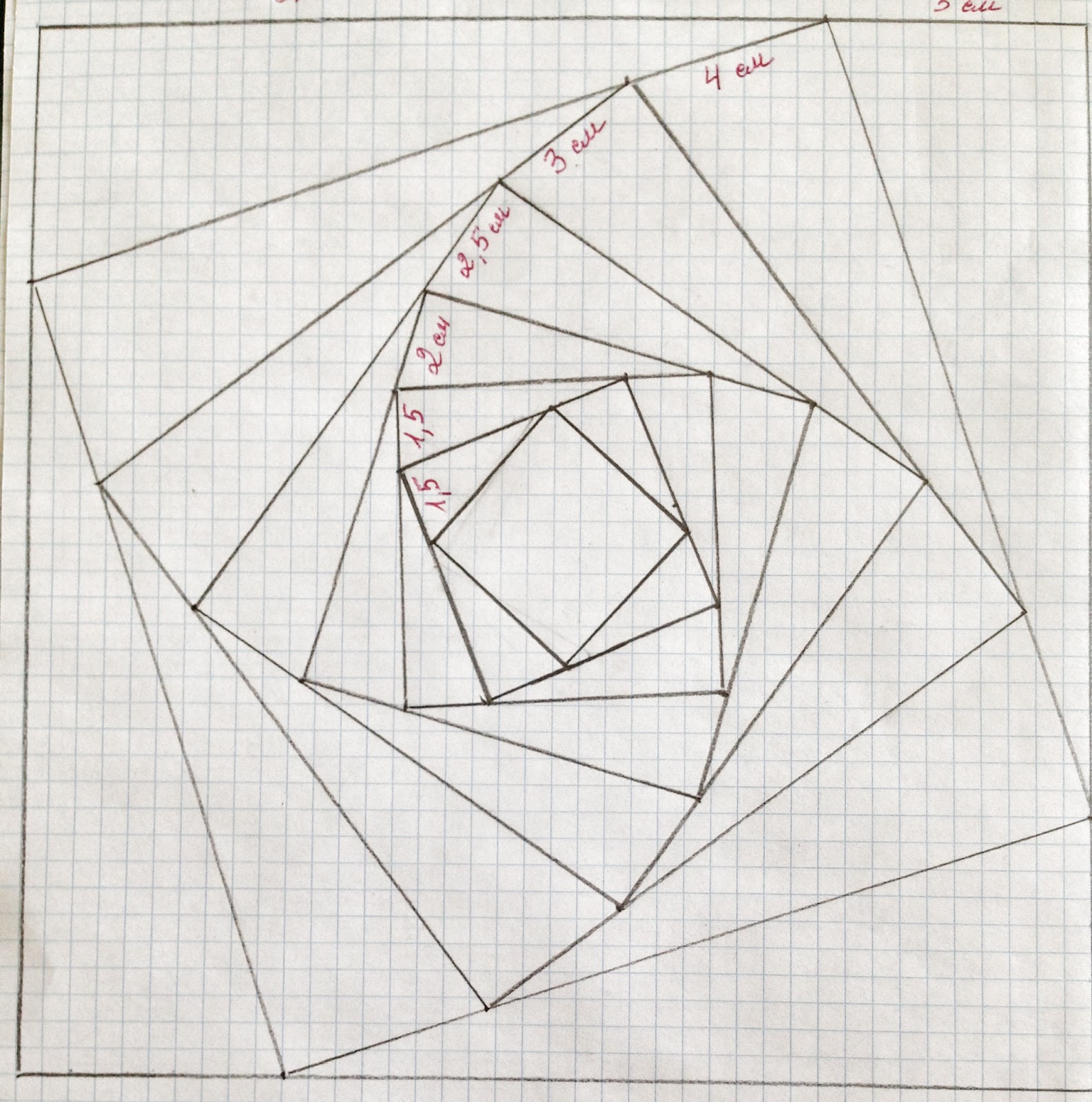 Расстояние от углов квадратов: квадрат № 1 - 5 см, далее - 4 см; 3 см; 2, 5 см; 2 см; 1, 5 см; 1, 5 см. И получается вот такой вариант поворота.
