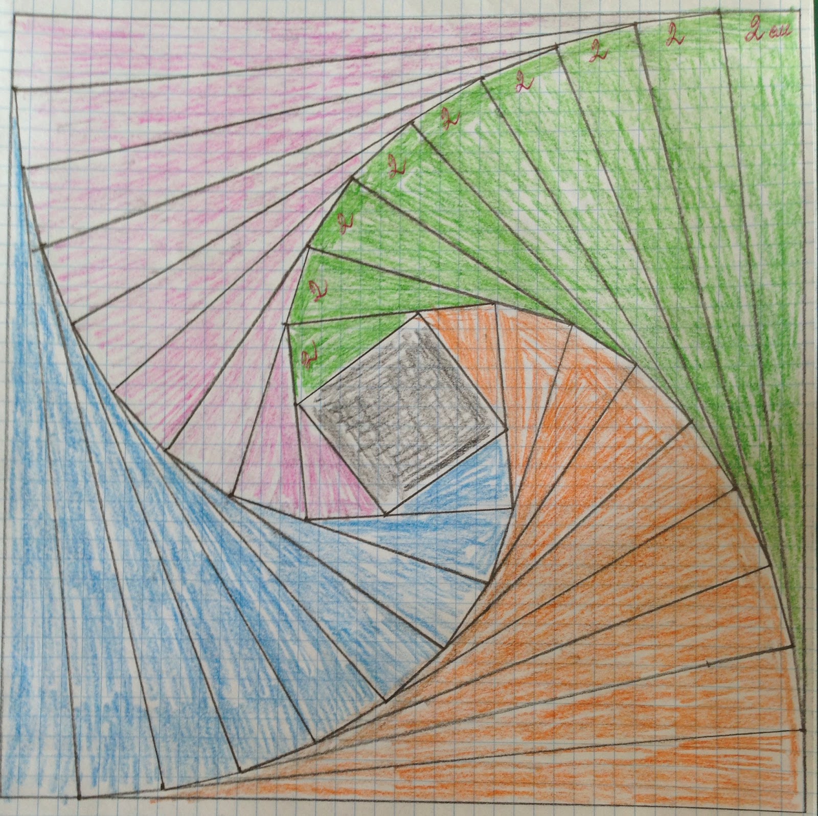 Если раскрасить каждый сектор, то становится понятной тайна, хитрость этого блока. Чертёж состоит из простых квадратов, а цветом выделяются не квадраты, а сектора. Обыкновенный обман зрения!