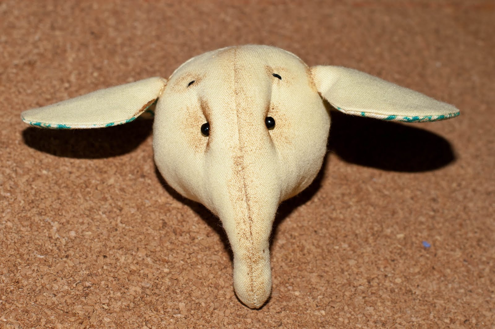 После тонировке давайте завершим наше мордашку, пришьем бусинки-глазки. Я своим слоникам еще бровки делаю, той же ниткой, что и глазки пришивала. Вот такая ушанка глазастая у нас вышла))