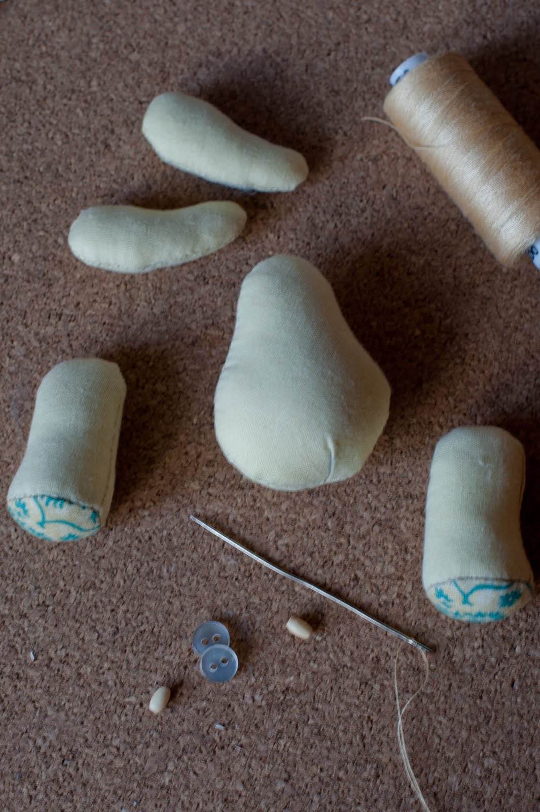 Ножки и ручки у нас будут на нитяном креплении, так как, как уже писала выше авторскую задумку с шплинтами, я пока не освоила)) Ножки я крепила пуговками, ручки, как более изящную часть тела, продолговатыми деревянными бусинами.