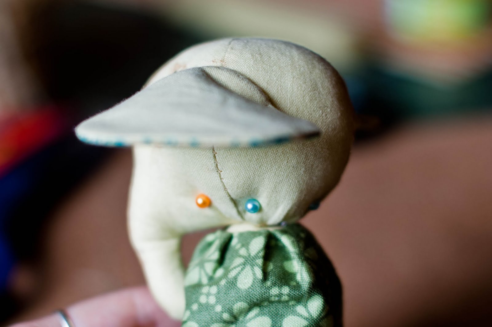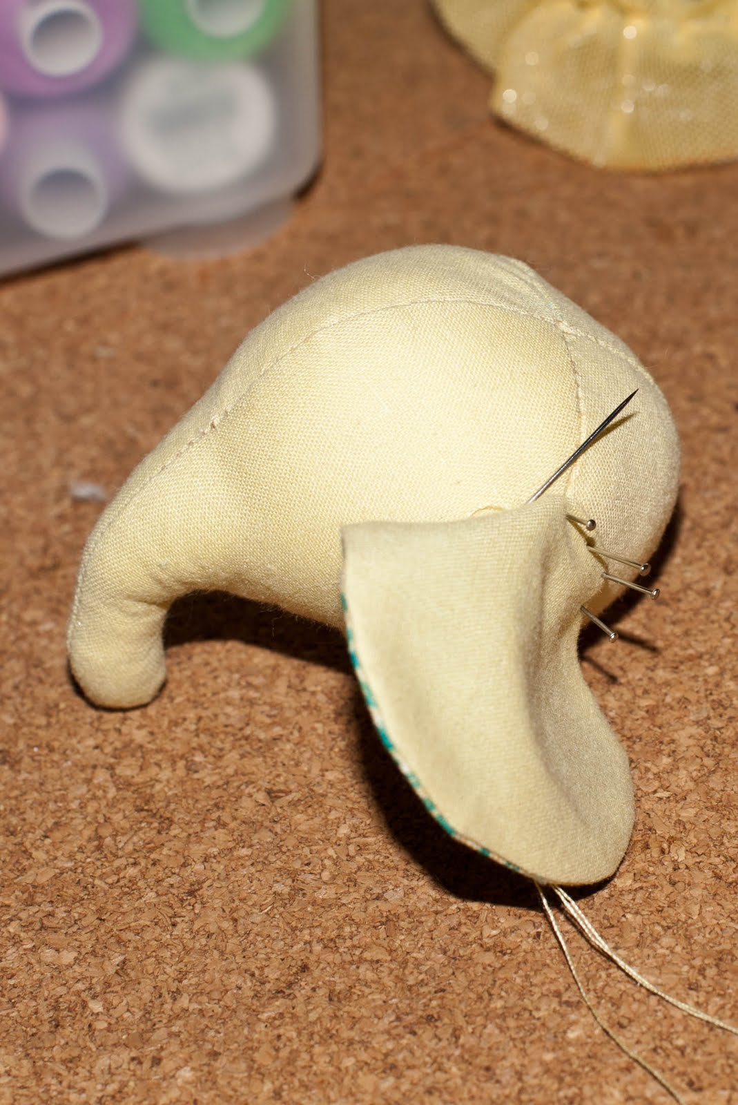 Приступим к голове. А точней к нашим ушкам. Ушки я предварительно зашила потайным швом и булавками крепим на голове, в том положении как вам нравится. Пришиваем потайным швом.
