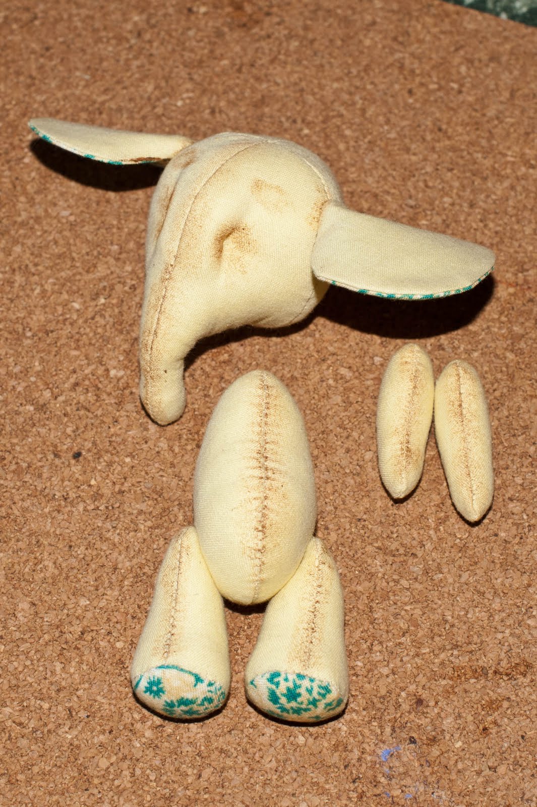 Дальше прострачиваем все наши детальки либо на машинке, либо как я ручками, шов за иголку. Голова- прошиваем передних шов с носиком, дальше прикалываем два клинышка и аккуратно сшиваем.