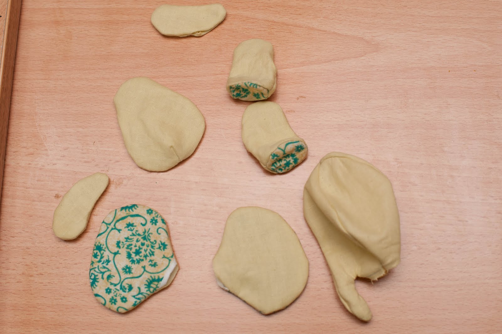 Вот что мы получаем в итоге. Не объемные детальки нужно прогладить, особенно швы, так они будут аккуратней потом выглядеть. Все припуски надсекаем в округлых местах перпендикулярно шву , что бы они потом не топорчились, после выворачивания.