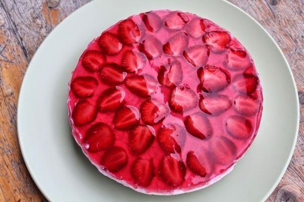 12. На следующий день вынуть торт из формы аккуратно перевернув на блюдо. Кусочки у торта ровные, бисквит внутри пропитан кремом, нежный. Сахара в бисквите и креме немного, сладость фруктов хорошо оттеняет торт. Любители желейных тортов будут в восторге!