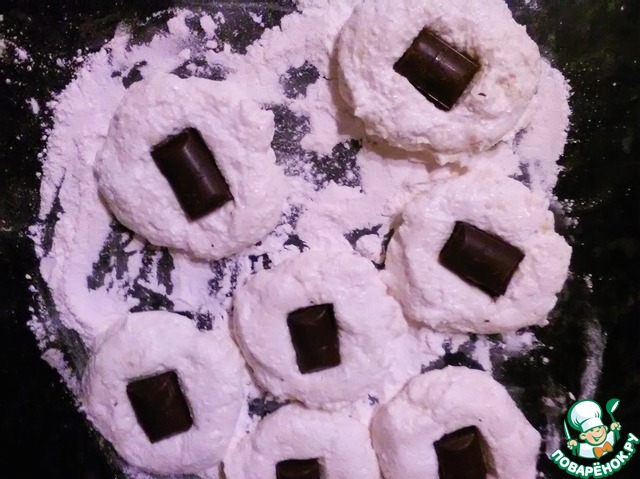 Из теста, мокрыми руками, формируем сырники и выкладываем их на стол посыпанный мукой. В середину каждого сырника, вдавливаем по одному кубику шоколада. |
