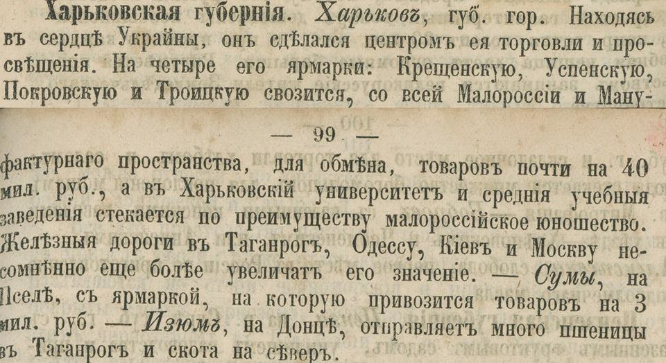 Это гимназический учебник географии 1873 г. Область расселения украинцев включает часть Курской и Воронежских губерний. Кубанские и азовские казаки считались украинцами. А теперь обратите внимание - как сказано о местонахождении нашего родного Харькова. "В сердце Украины"! Даже не Малороссии - Украины! Абсолютно украинская Харьковская губерния не была пограничной с Россией территорией. Её окружали другие украинские земли, в том числе с севера и востока - значительные части Курской и Воронежской губерний. Так что, господа гимназисты в отличие от наших неграмотных современников знали, где на самом деле находится сердце Украины.