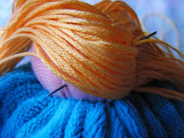 Точно так же второй хвостик. И удобнее той же ниткой, вот зачем длинная нужна была. Когда перебрасываете нитку на другую сторону, лучше делать это в 2-3 стежка (через пробор, например), выходы нитки наружу прятать под волосами. Так все это будет крепче держаться, шерсть сама держит нитку. В конце так же – несколько ходов туда-сюда по голове куколки, и обрезаем нитку (если еще осталось, что обрезать).