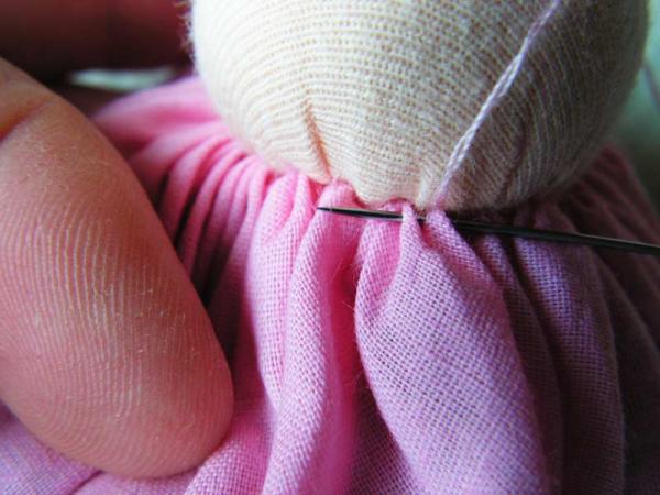 Юбочку стягиваем так, чтобы влезала голова (см. фото), завязываем узелок, нитку не обрезаем! Теперь вставляем голову, и соединяем с туловищем по кругу этой ниткой. Вставляем «спина к спине», то есть узелок к узелку. Юбочку цепляем над ниткой стяжки, захватываем по 3 складочки, голову прихватываем, отступив от стяжки примерно 7-8 мм; как она лежит в юбочке, так и соединяем. Ну и на глаз контролируем, чтобы выглядело все симметрично, и одно ухо не было выше другого. Трикотаж расправляем по ходу дела, особенно спереди, сзади потом скроется под волосами. Складочек юбки обычно как раз хватает на круг. Если велюр, то по 2 складочки, смотрите по обстоятельствам.