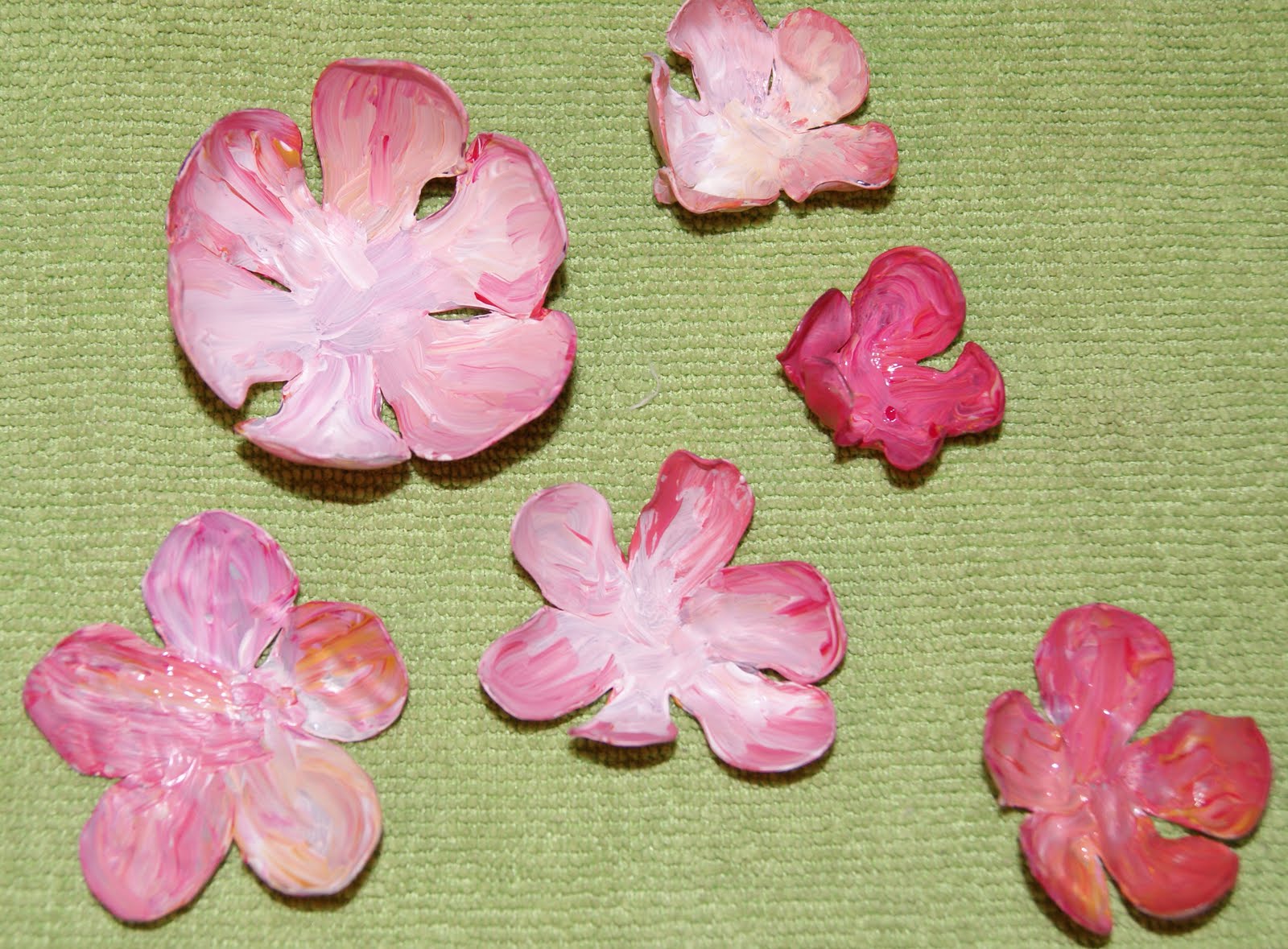 и не смешивая их между собой (брала на кисточку так, чтобы попало каждого цвета по чуть-чуть), разукрасила мои заготовки с обеих сторон, стараясь сделать их более-менее похожими на лепестки настоящего цветка: краешки более насыщенного цвета, и лепестки в центре тоже более темные..