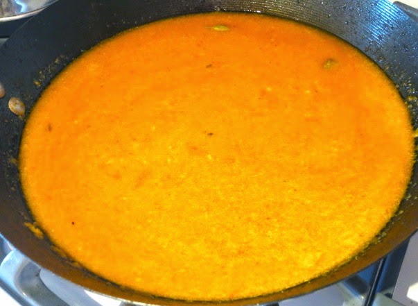 Добавляем томатное пюре, молотый красный перец, молотую зиру, молотый фенхель (если используем) и соль. Доводим до кипения и готовим минут 5, пока масло не начнет отделяться от соуса.