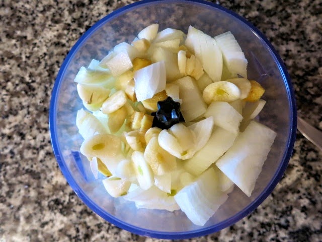 Кладем лук, чеснок и имбирь в маленький кухонный комбайн. Перемалываем в пюре.