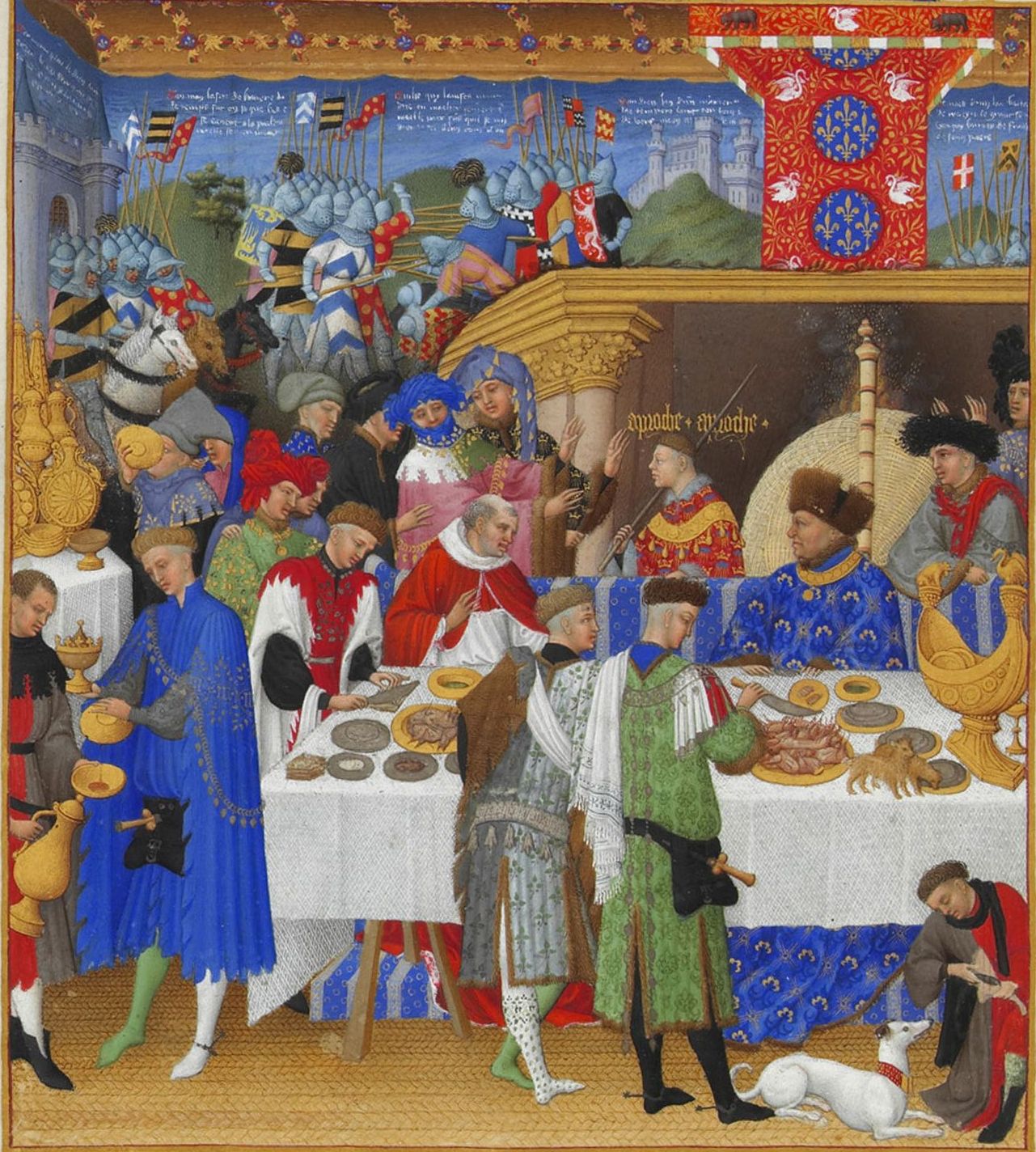 В бургундское время эта форма также присутствует: живой фазан на знаменитом пиршестве в Лилле. Обеты приносят Господу и Деве Марии, дамам и дичи.
