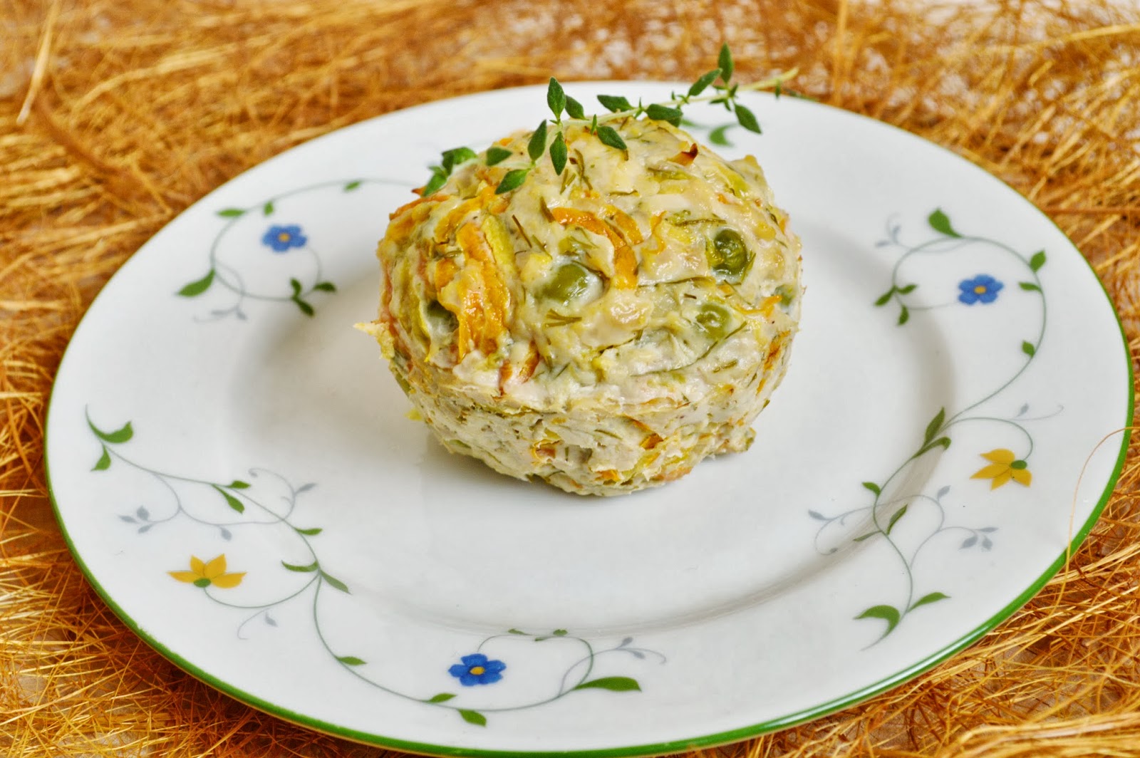 Все перемешайте и положите размороженный зеленый горошек. Еще раз тщательно перемешайте.