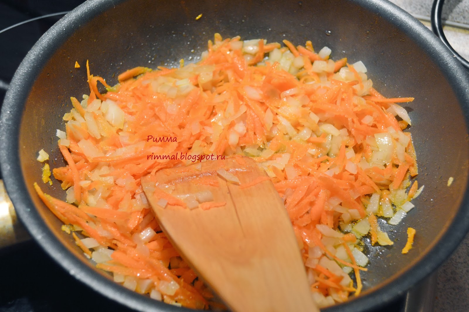 Морковь натрите на терке, лук порежьте кубиком. Обжарьте овощи на растительном масле, пока они не станут мягкими.