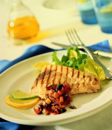 1. 120–150 грамм запечённой морской рыбы с соком половины лимона, луком и зеленью. Гарнир из овощей.