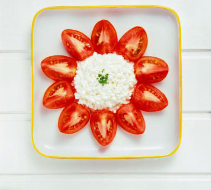 70–80 грамм обезжиренного творога (жирность не более 8%) с половинкой помидора и зеленью.