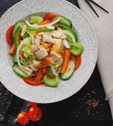 Нежирное отварное мясо. В качестве гарнира — любой листовой салат или салат из овощей.