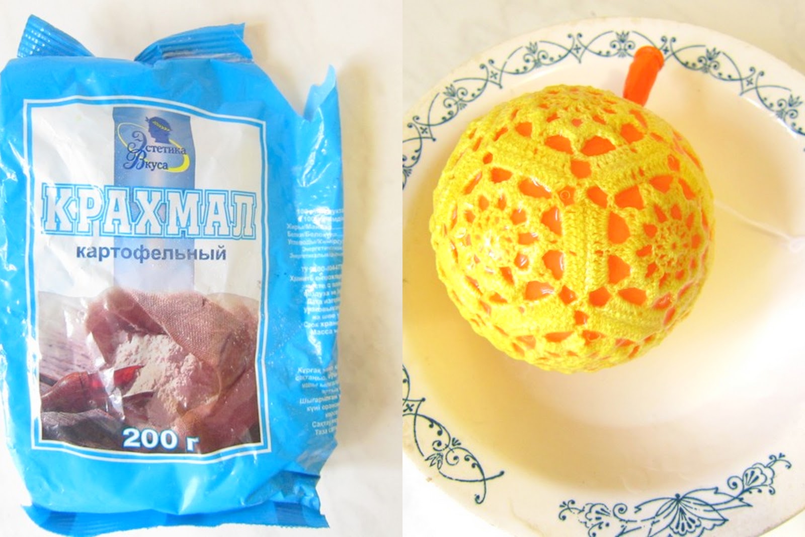 Материалы: нитки "Ирис", крючок №1,3 (раньше я вязала №2,7, шары получались крупнее), крахмал, воздушный шарик.