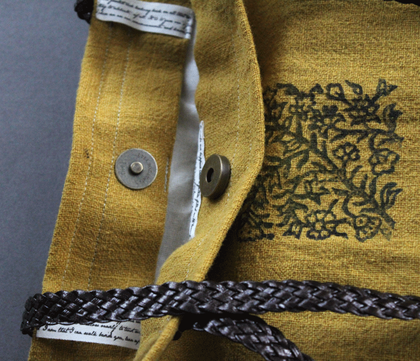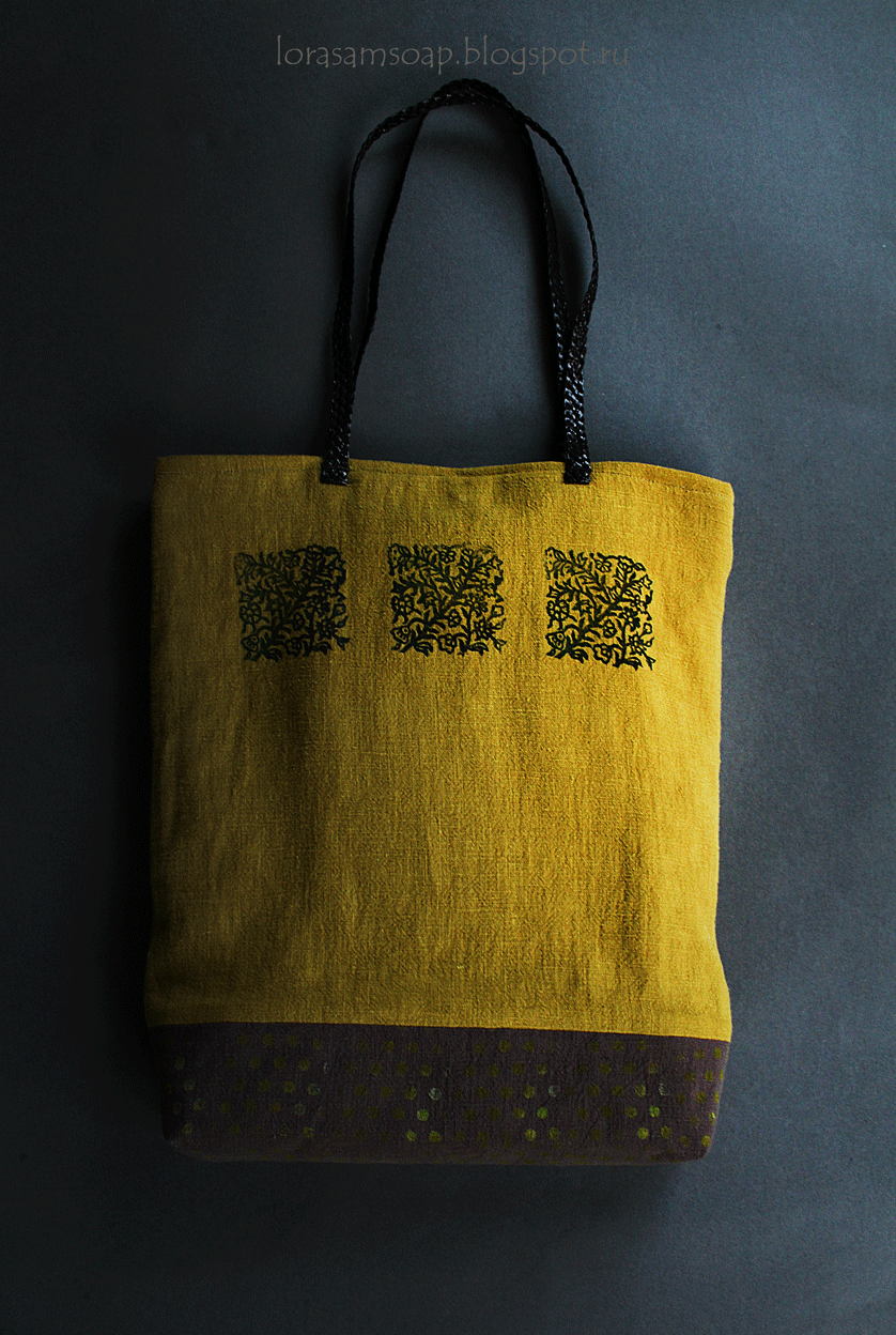 Весной меня тянет на сумочки-авоськи) Каждый раз они разные. Покажу пока две. Первая - льняная ткань, ручная набойка, мягкий дублерин, без подклада, плетеные ручки, внутренний карман.