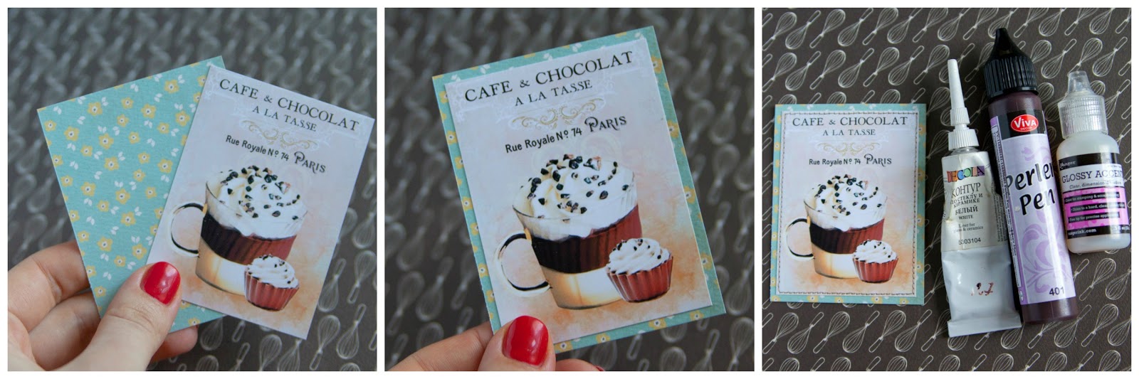Далее буду оживлять картинку. Ранее, как только начинала делать магниты, я использовала просто картинки, а потом мне захотелось их оживить: чтоб крем был как настоящий, чтобы кофейная гладь блестела и т.д.)) Для этого я использую контурные краски ( я беру и для ткани и для стекла,подойдут любые), глосси (прозрачный клей, который при заствании оставляет глянцвый блеск), также иногда использую жидкий жемчуг, микробисер, блестки и просто бисер.