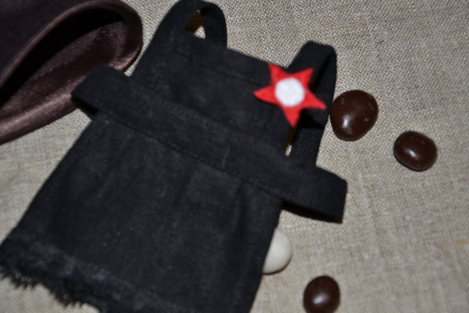 Фартук из льняной ткани, шьется очень просто. Звездочка из тонкого фетра - склеила титаном 2 слоя, пока клей не высох, пальцами корректируем форму. Белый кружок в центре - фетр на клею.