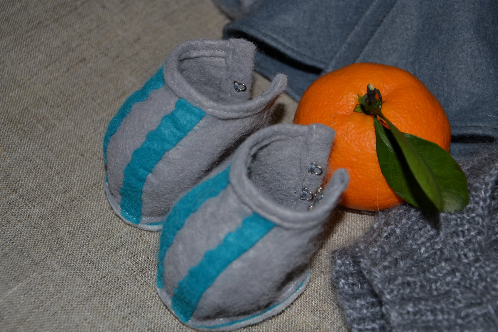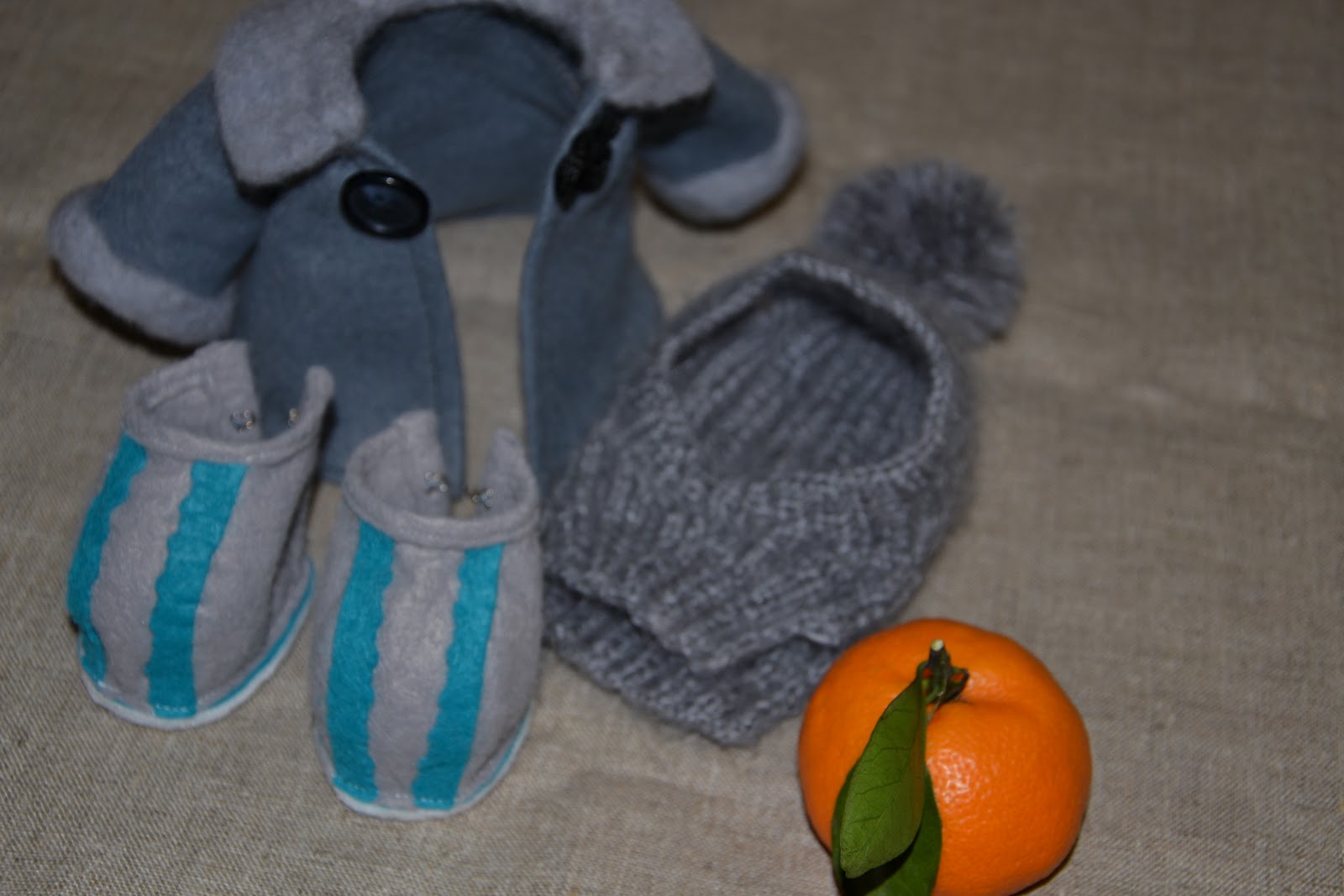 Пальтишко из фетра (состав: шерсть, вискоза), воротничок и манжеты - сухое валяние (манжеты приваляны к готовому изделию, воротничок пристрочила машинкой), шапочка из мохера, боты из тонкого фетра, подошва из толстого фетра.
