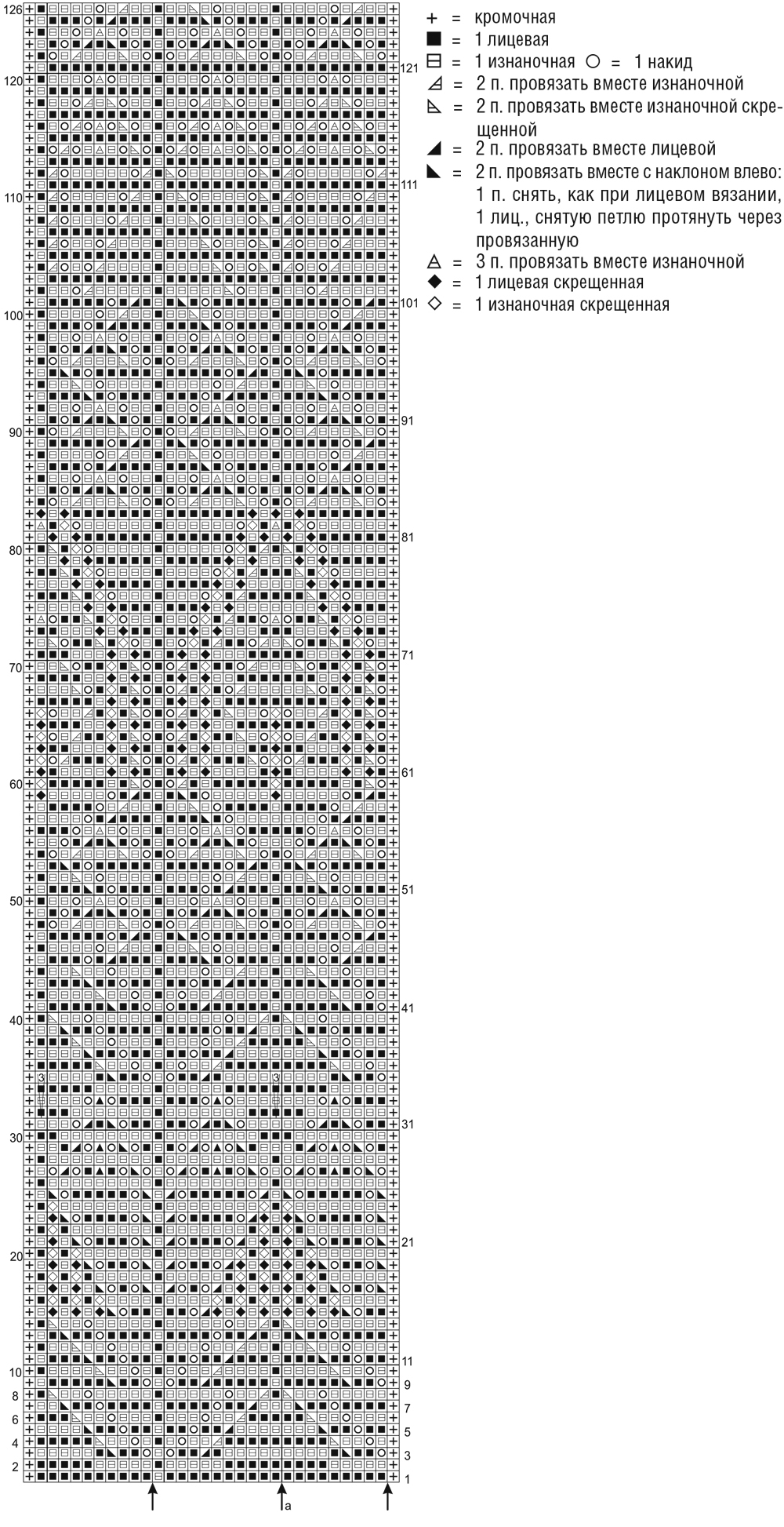 В высоту 1 раз выполнить с 1-го по 46-й р., затем повторять с 47-го по 126-й р. Следить за тем, чтобы количество накидов и провязанных вместе петель во внешних раппортах было одинаковым.