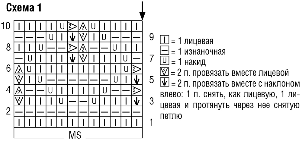 Количество петель кратно 12 + 2 кромочные. Вязать по схеме 1. На ней даны лицевые и изнаночные ряды. Начать с кромочной, раппорт постоянно повторять, закончить кромочной. С 1-го по 10-й ряд связать 1 раз, затем 3—10-й ряды постоянно повторять.