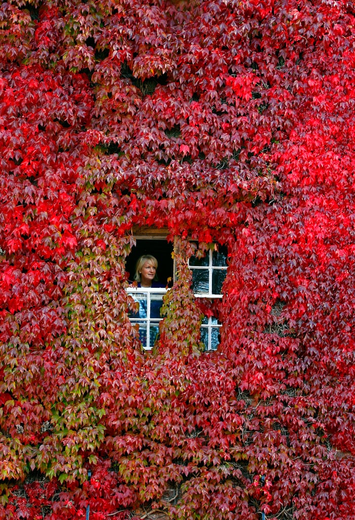 Море красных листьев. Здание дворца бракосочетания Capesthorne Hall, оплетенное виноградом, в Маклсфилде, графство Чешир, Англия.