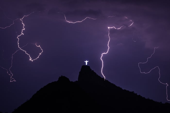 Молнии освещают статую Христа на холме Корковаду в Рио-де-Жанейро.