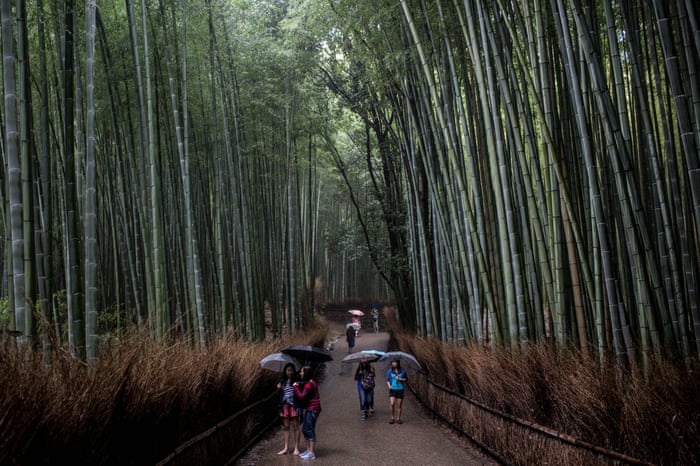 Туристы бродят в знаменитом бамбуковом лесу Сагано. Киото, Япония.