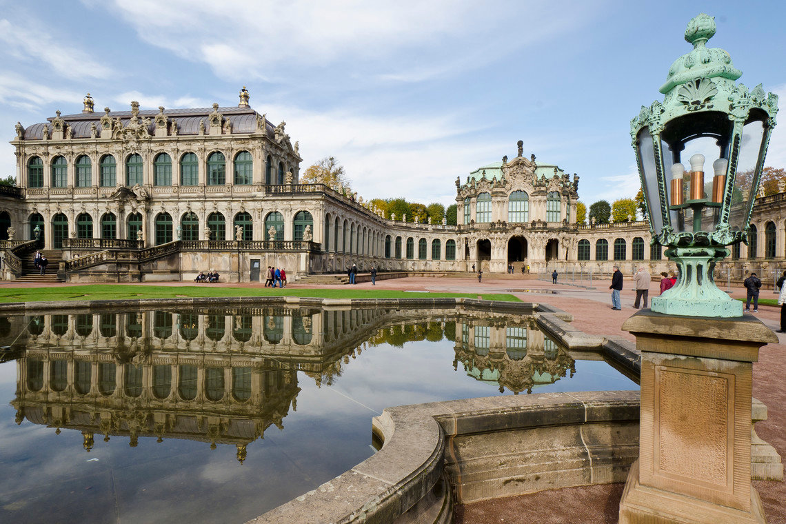 Начало было положено в 1709 году, когда по приказу правителя Саксонии Августа Сильного было возведено деревянное сооружение для оранжереи. Оно стало декорацией для праздников и турниров саксонского дворянства. Из камня, в стиле барокко, три стороны Цвингера были построены до 1732 года немецким архитектором Маттеусом Даниэлем Пёппельманном. Четвёртая, неоренессансная сторона архитектурного ансамбля, спроектированная Готфридом Земпером для картинной галереи и собрания скульптуры, была возведена в 1847-55 годах.