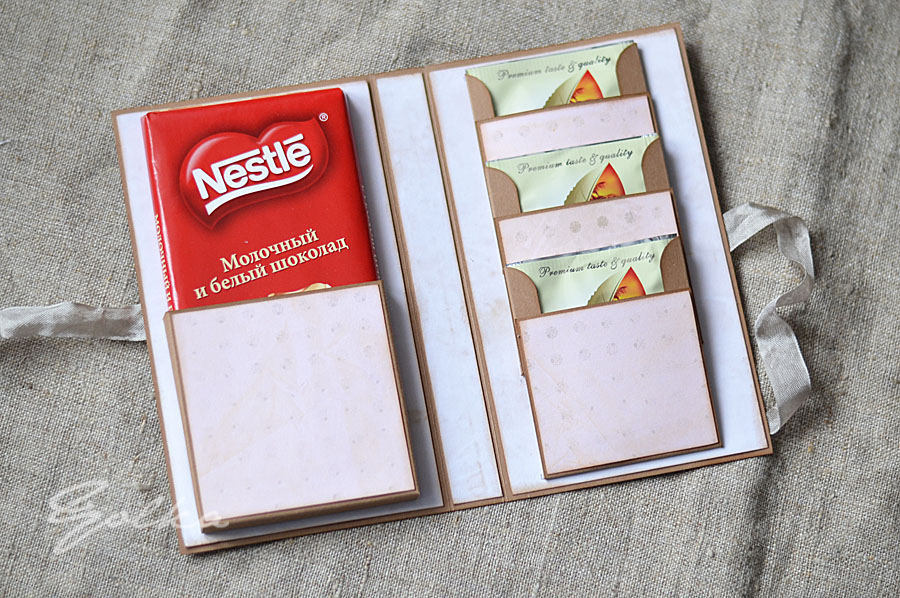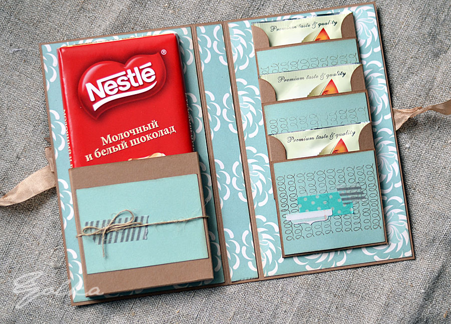 Вот, собственно, и все сложности :) осталось приклеить кармашки к основе (предварительно обклеенной скрап-бумагой). Не забудьте примерить шоколадку и пакетики :)
