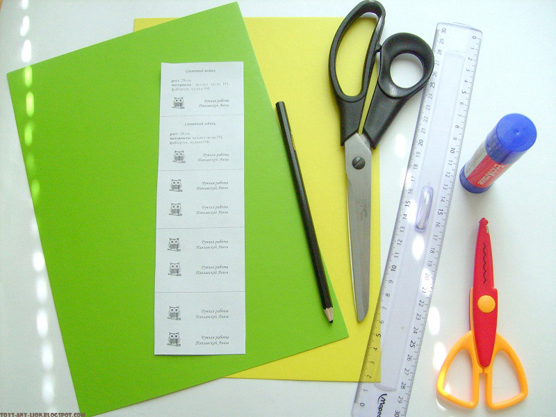 Для работы нам потребуется: два листа цветного картона, распечатка с данными игрушки и автора, карандаш, ножницы обычные, ножницы фигурные, клей карандаш, линейка.