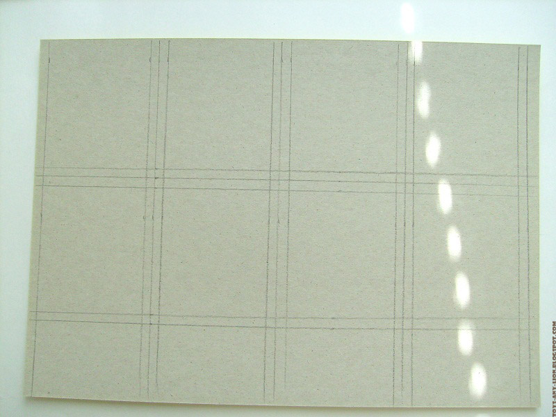 Размер бирок выбрала таким образом, чтобы было меньше остатков от работы. Лист картона (у меня 28,8см х 20,5см) разлиновываем на квадраты 7см х 8см. Это будет основная сетка. Так как с фигурными ножницами я дело не имела, то первые бирки вышли криво, и я решила сделать еще дополнительную сетку - с каждой стороны от основной линии на расстоянии 0,5 см начертила дополнительные.