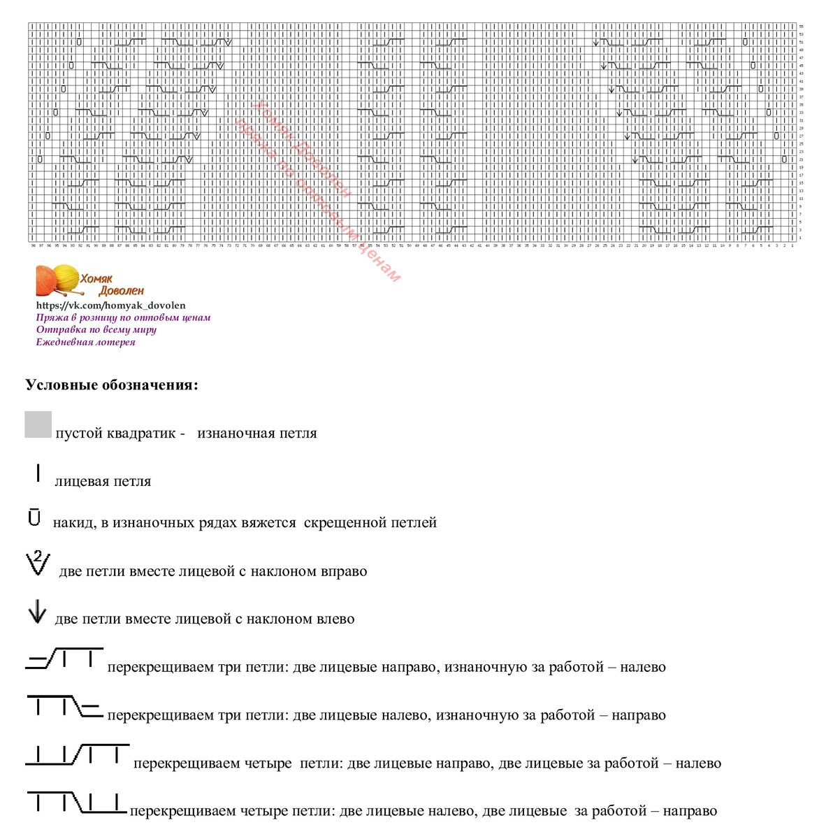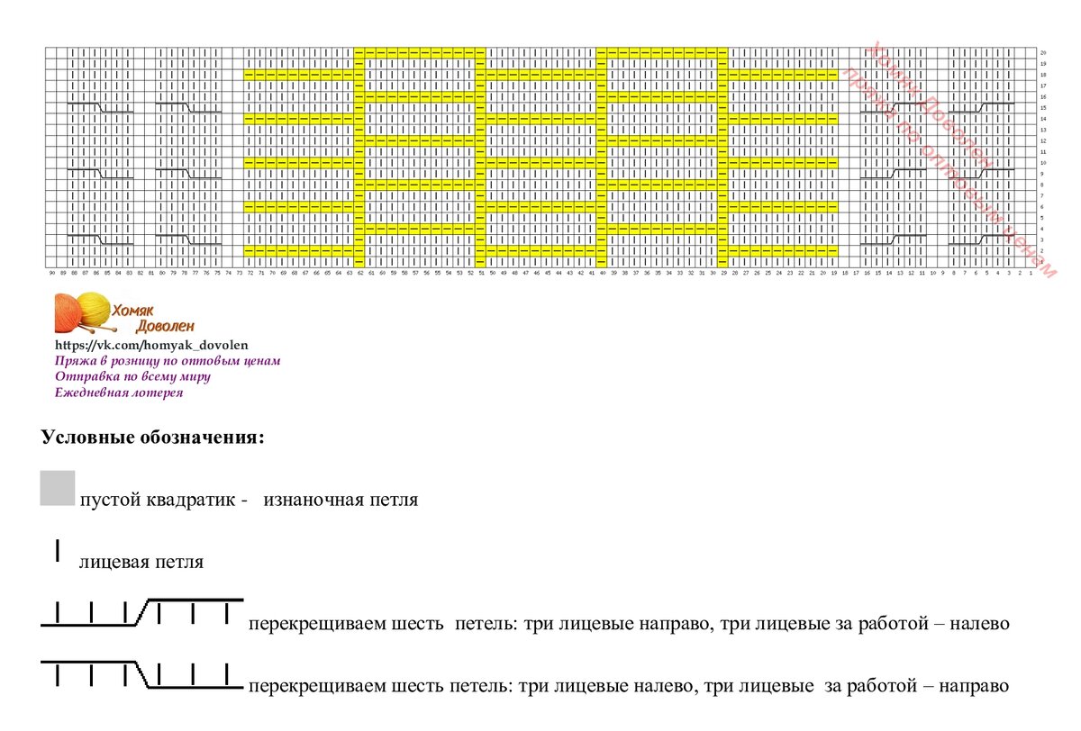 Схема нарисована для всех рядов (не только для лицевых). Желтым цветом я выделила изнаночные петли, чтобы был выделен узор и было удобно вязать.